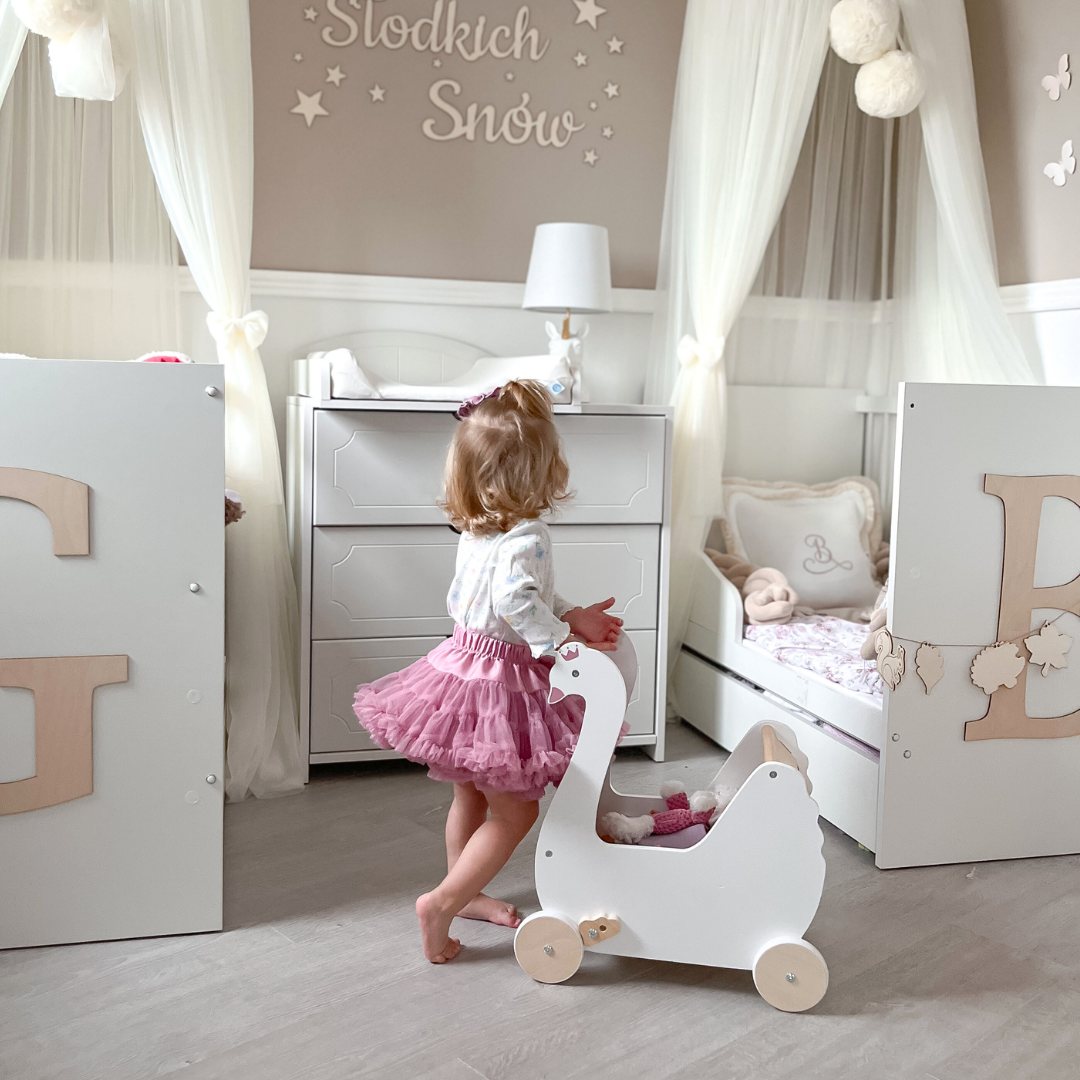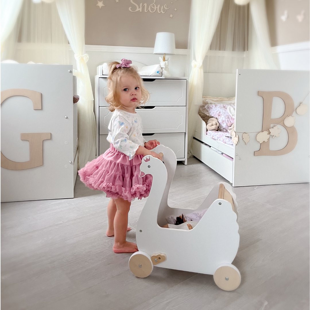 Puinen nukenvaunu Swan voi toimia lapsellesi liikkuvana lelusäiliönä ja apuvälineenä ensimmäisissä itsenäisissä askeleissa. Sen ansiosta taapero voi viedä lempinukkensa tai -nukkeksensa kävelylle puistoon tai toiseen huoneeseen matkien omia vanhempiaan ja leikkien heidän rooliaan.