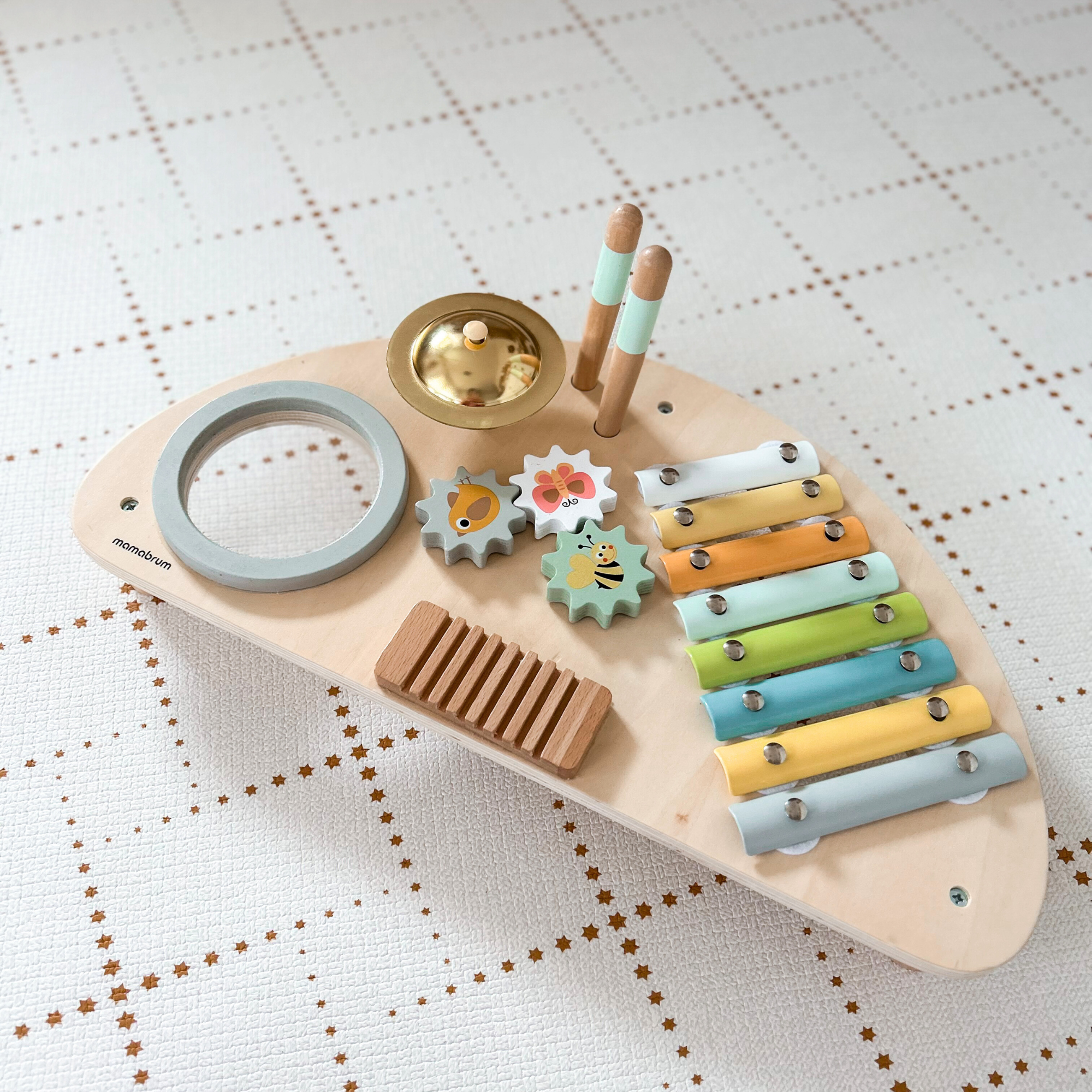 Puinen musiikkikeskus innostaa luovaan leikkiin. Sisältää minirummut sauvoilla, ksylofonin, pyörivät hammasrattaat värikkäillä hyönteisillä ja paljon muuta! Lelu tarjoaa lapsille runsaasti viihdettä samalla kun se edistää uusien taitojen oppimista, parantaa silmä-käsi-koordinaatiota ja kädentaitoja. Sen avulla pikkulapset voivat omaksua musiikkivirtuoosin roolin. Ehkä se herättää pienessä lapsessasi uuden intohimon!