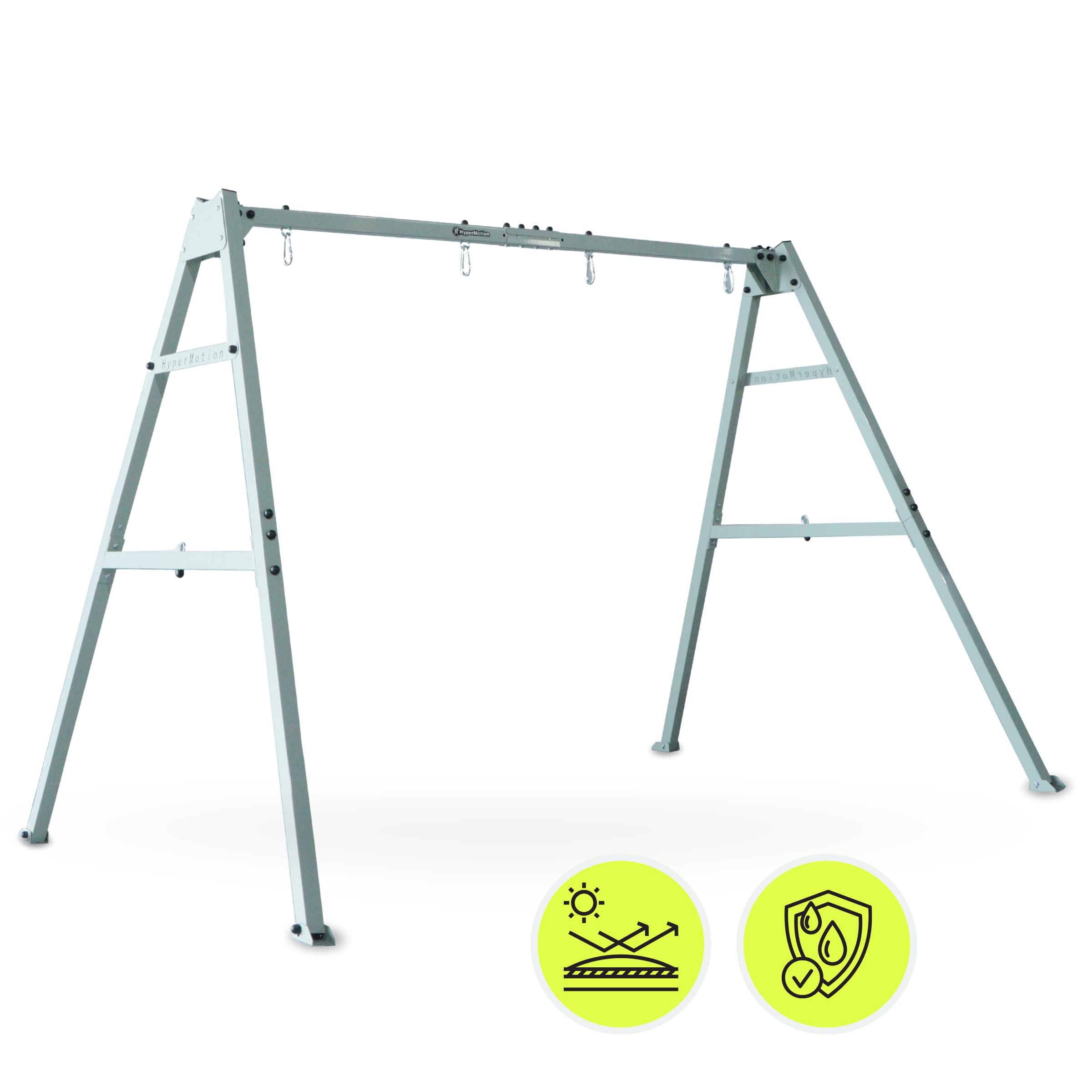Teräsrungolla varustettu kehikko tarjoaa lapsillesi paitsi houkuttelevan myös turvallisen leikkipaikan. Siinä on vakaa ja tukeva rakenne. Vakaan ja tukevan rakenteensa ansiosta lisävarusteita voi käyttää jopa kolme henkilöä samanaikaisesti! Teräskehikko sopii täydellisesti viihdyttämiseen ja rentoutumiseen. Keinujen lisäksi siihen voidaan kiinnittää mukava riippumatto - täydellinen paikka rentoutumiseen raittiissa ilmassa.