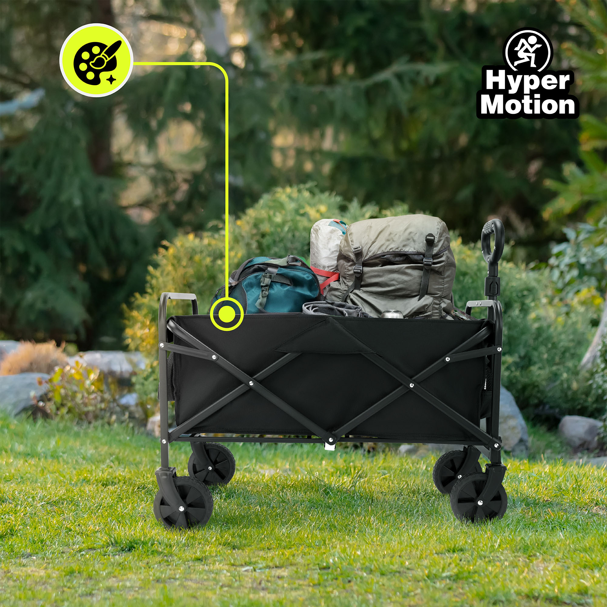 HyperMotion-retkivaunu takaa mukavan ja turvallisen otteen ja kuljettaa samalla turvallisesti kantamasi tavarat. Voit helposti säätää kahvan tarpeisiisi sopivaksi säätämällä sen etäisyyttä maasta ja kallistuskulmaa. Suuret maastopyörät takaavat tasaisen kulun sekä päällystetyillä pinnoilla että hiekkaisilla tai kuoppaisilla teillä.