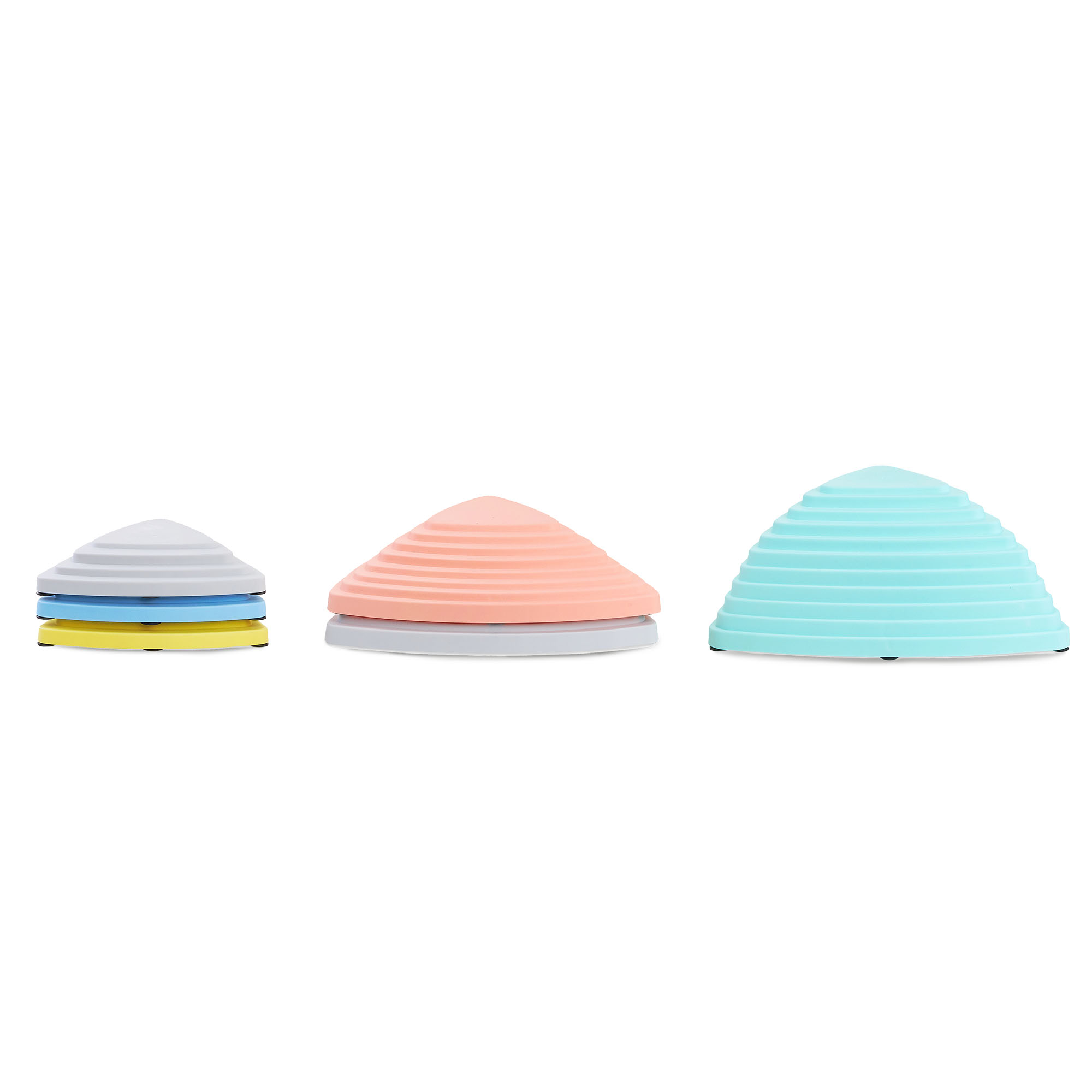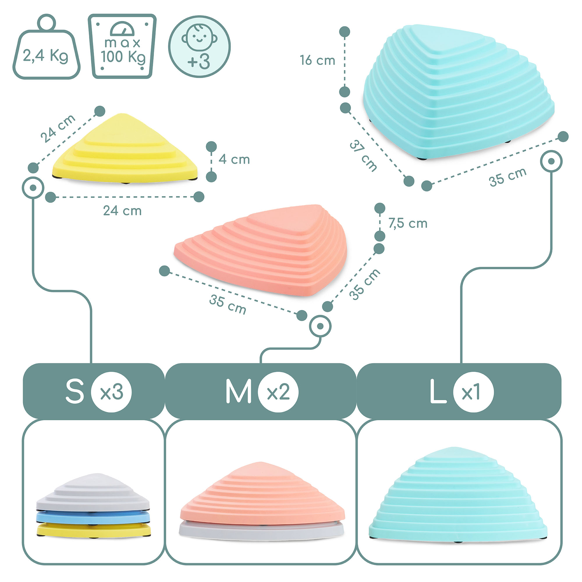 Aistikivienliukumaton pinta ehkäisee lasten kivuliaita kaatumisia ja antaa jaloille erinomaisen pidon. Kestävän mutta kevyen muovin ansiosta setti sopii erinomaisesti pienten lasten leikkeihin ja tasapainoharjoituksiin ja tukee heidän motorista kehitystään turvallisella tavalla.