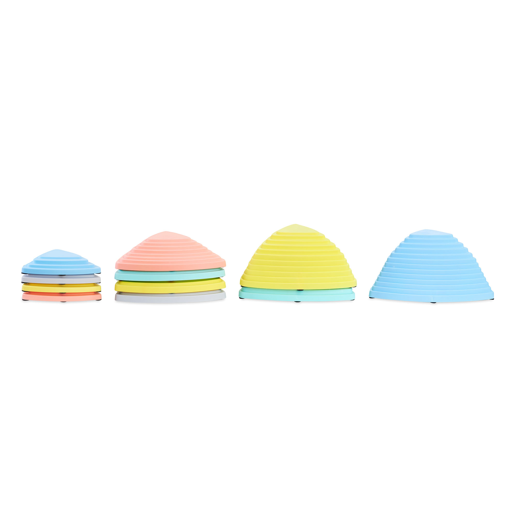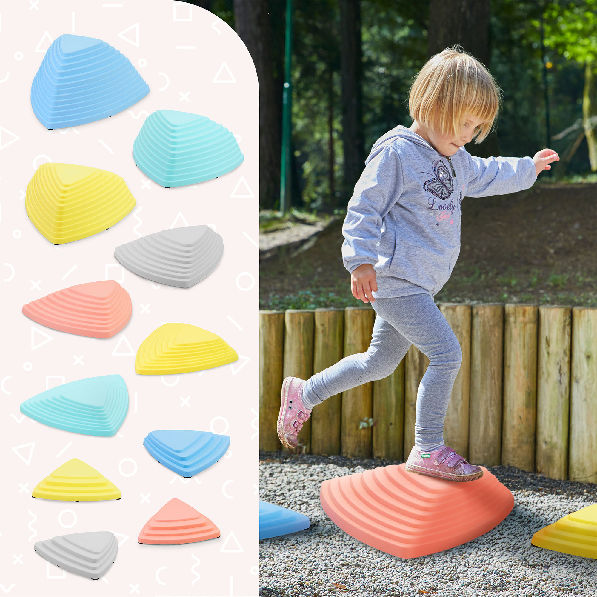 Aistikivienliukumaton pinta ehkäisee lasten kivuliaita kaatumisia ja antaa jaloille erinomaisen pidon. Kestävän mutta kevyen muovin ansiosta setti sopii erinomaisesti pienten lasten leikkeihin ja tasapainoharjoituksiin ja tukee heidän motorista kehitystään turvallisella tavalla.