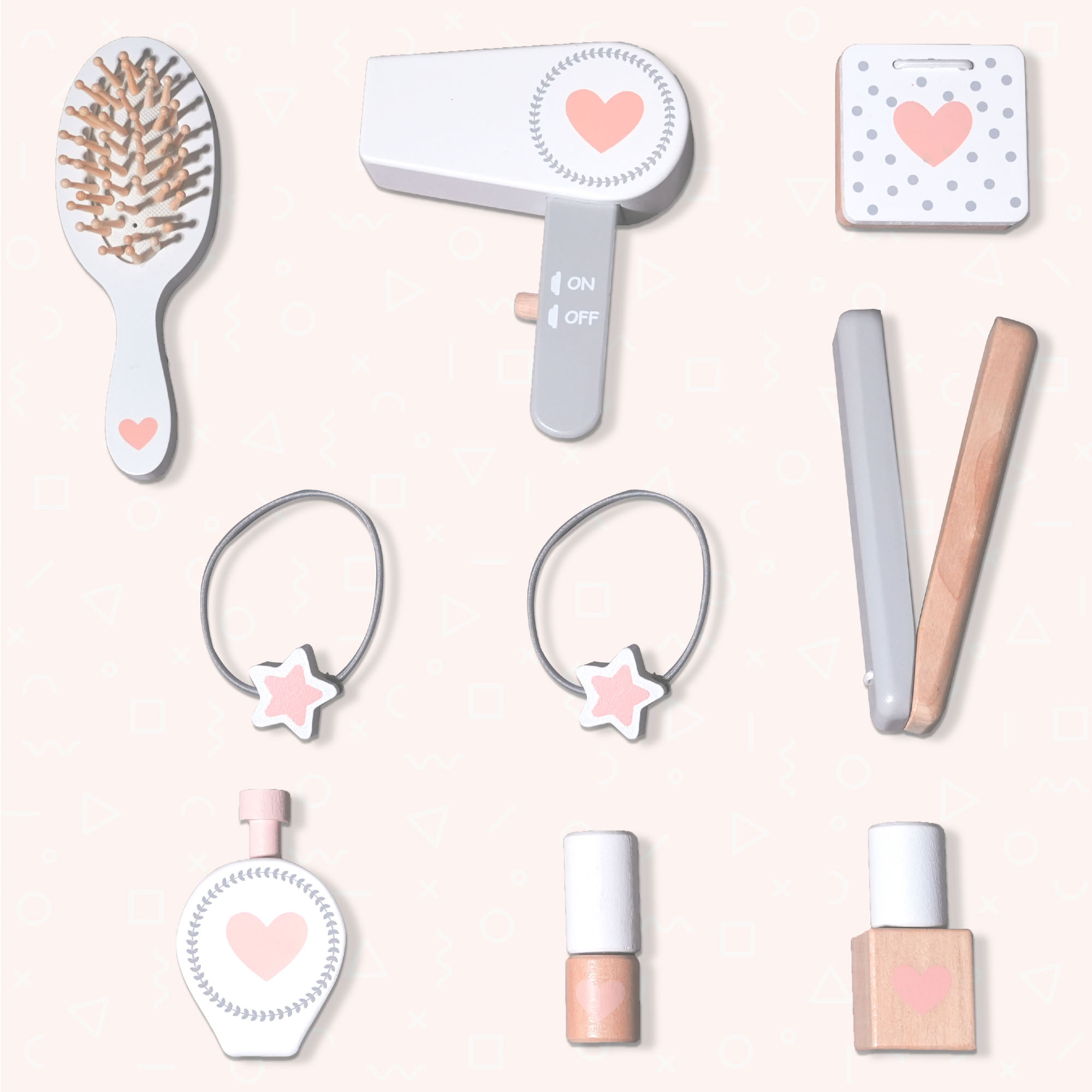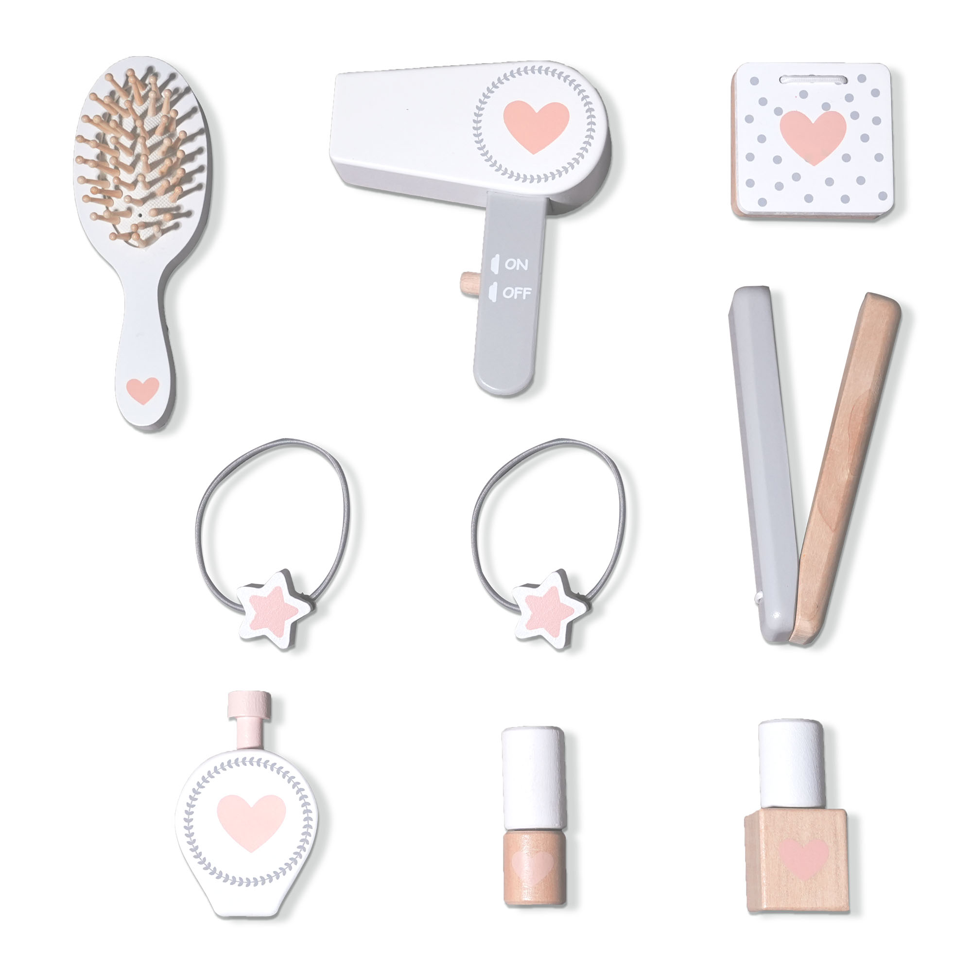 - Mukana jopa 9 tarviketta: hiusharja, hiustenkuivaaja, luomiväri, 2 kuminauhaa, hiusten suoristusrauta, hajuvesi, kynsilakka, huulipuna