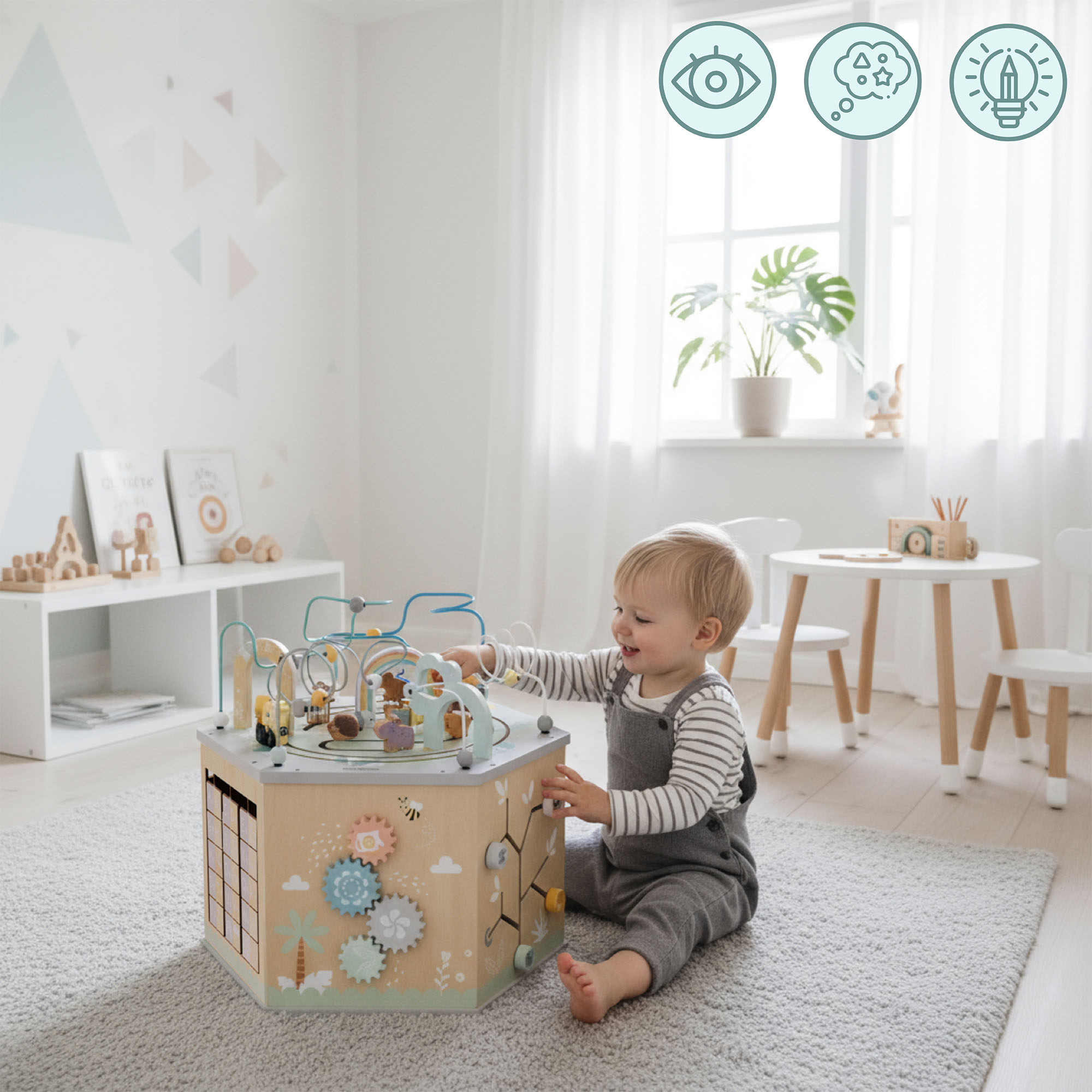 Tämä opettavainen kuutio on kehityskeskus – jokainen aktiviteetti tukee lasten eri taitoja . Kello opettaa varhaisia ajankäsityksiä, aakkoset ja 26 englanninkielistä sanaa kehittävät kieltä, ja rattaat ja eläinlaatat stimuloivat uteliaisuutta ja loogista ajattelua . Muodonlajittelija, manipuloitavat sokkelot ja motoriset silmukat kehittävät kädentaitoja , kärsivällisyyttä ja koordinaatiokykyä . Värikkäät tunnelit, hahmot ja eläinjuna kehittävät mielikuvitusta ja luovuutta. Tämän monimuotoisuuden ansiosta lapset oppivat ja leikkivät samanaikaisesti, tutkien maailmaa monella tasolla.