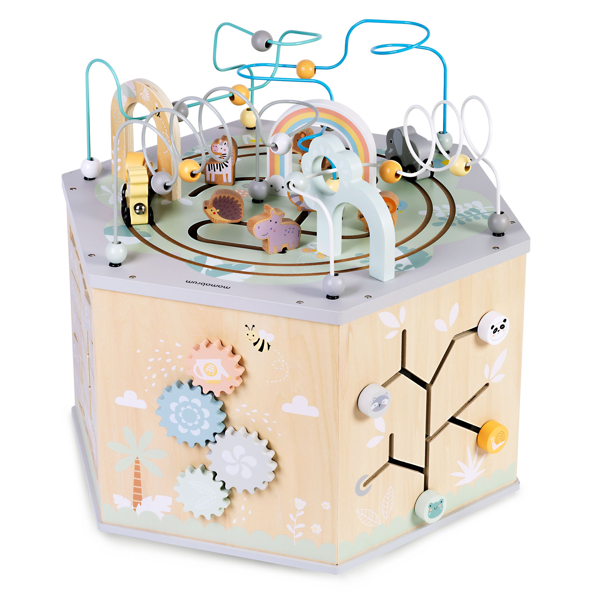 Anna lapsellesi lelu, joka ilahduttaa häntä monipuolisuudellaan ja pitää hänet kiireisenä tuntikausia! Tämä suuri ja monitoiminen opetuskuutio on todellinen toimintakeskus , joka tukee lapsesi kehitystä leikin kautta. Jokaisella puolella on eri tehtävä – helmien siirtämisestä muotojen yhteensovittamiseen ja hammaspyörien kääntämiseen. Pehmeät värit, suloiset eläimet ja ystävälliset kuvitukset tekevät kuutiosta paitsi lelun myös koristeellisen lisän lastenhuoneeseen .