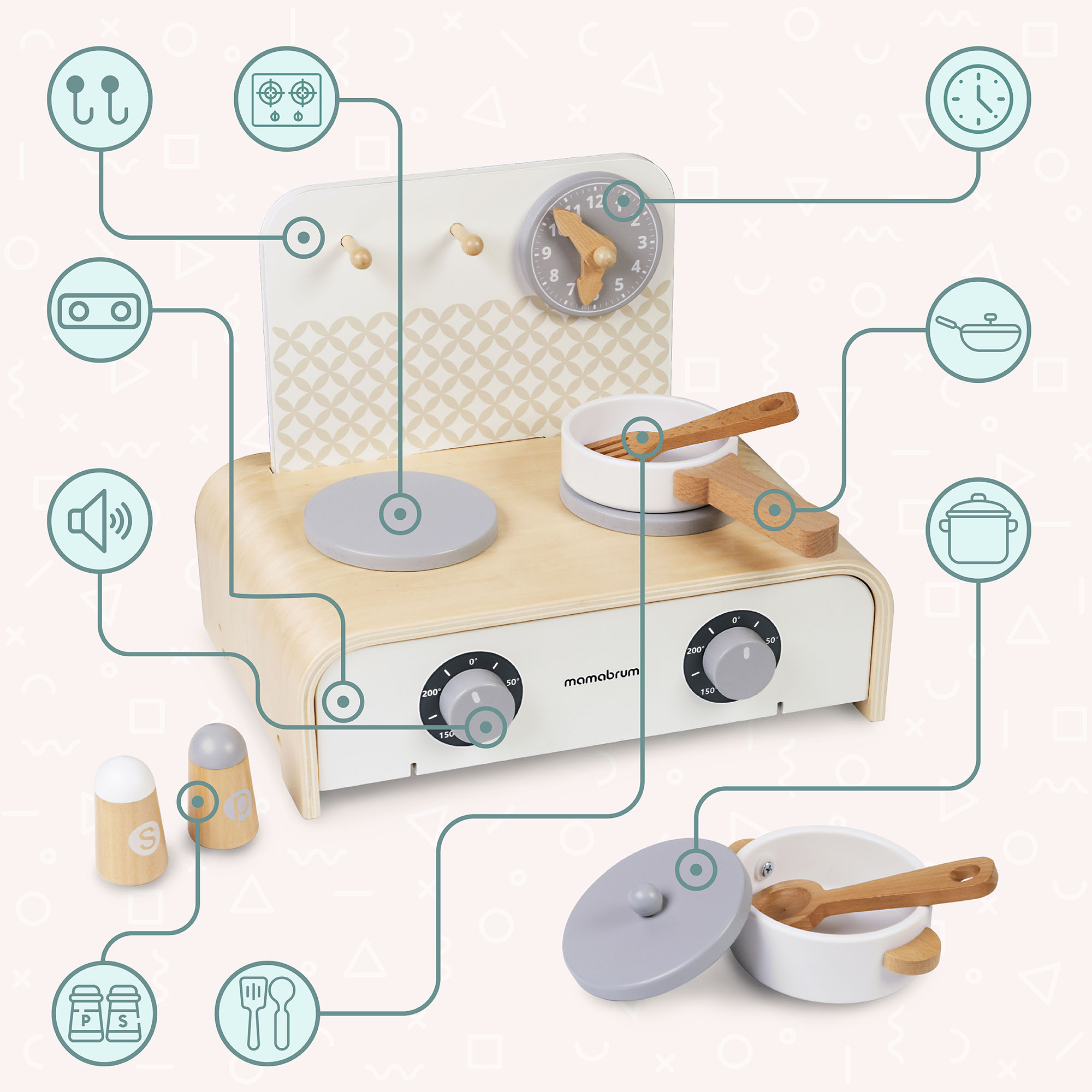 Tässä minikeittiössä on kaikki, mitä pieni kokki tarvitsee aloittaakseen kulinaarisen seikkailunsa. Setti sisältää kattiloita, paistinpannun, suola- ja pippurisirottimen sekä puisia aterimia , joiden avulla lapset voivat luoda arkipäiväisiä keittiötilanteita. Napsahtelevien nuppien kääntäminen, ajan mittaaminen kellosta ja "kypsentäminen" kahdella polttimella antavat lapsille mahdollisuuden matkia aikuisia ja luoda omia reseptejä, mikä lisää leikkikokemukseen realismia ja jännitystä.