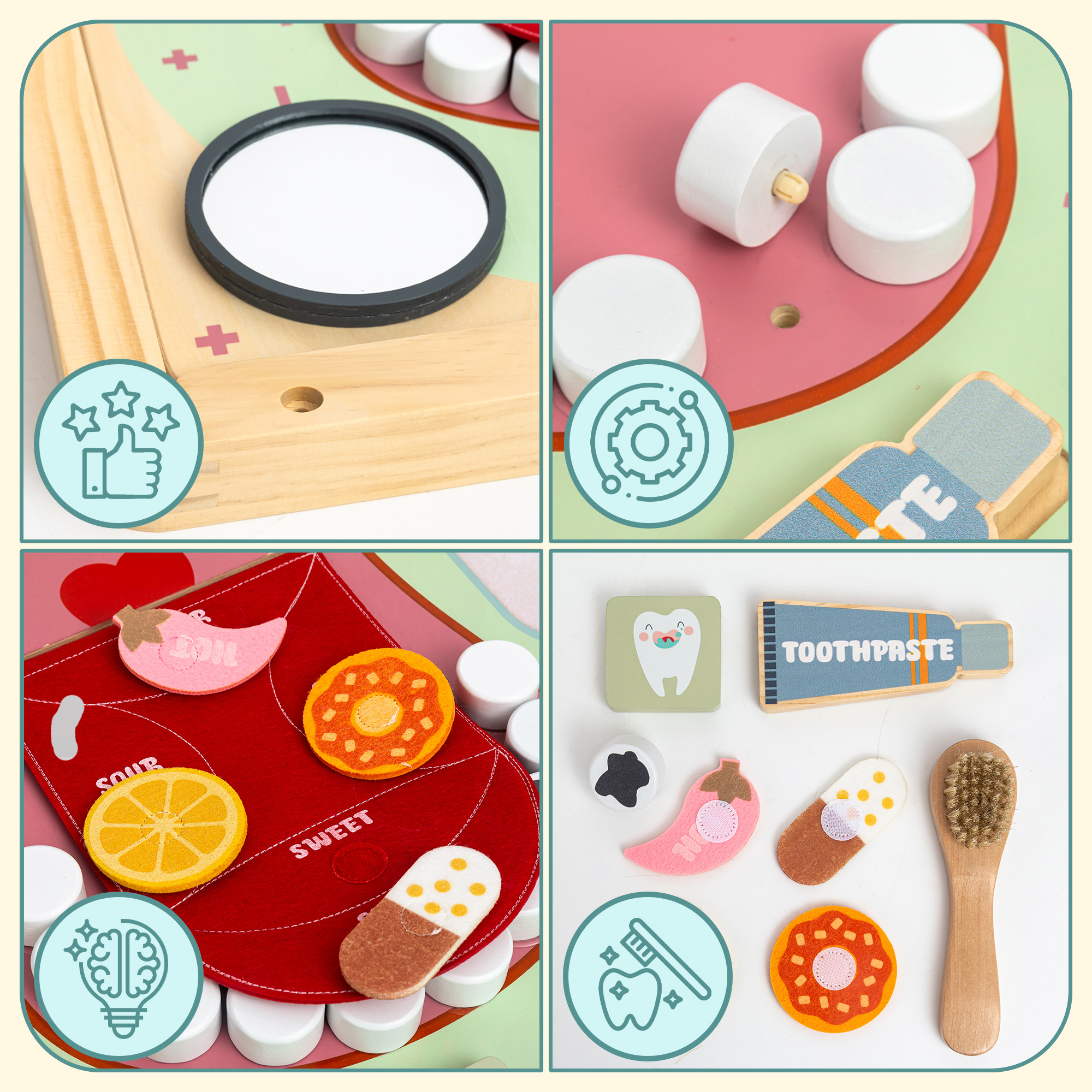 Puinen Montessori-opetuslauta Pieni hammaslääkäri - hammasharja, hammastahna, irrotettavat hampaat, peili, ruoka, makujen oppiminen