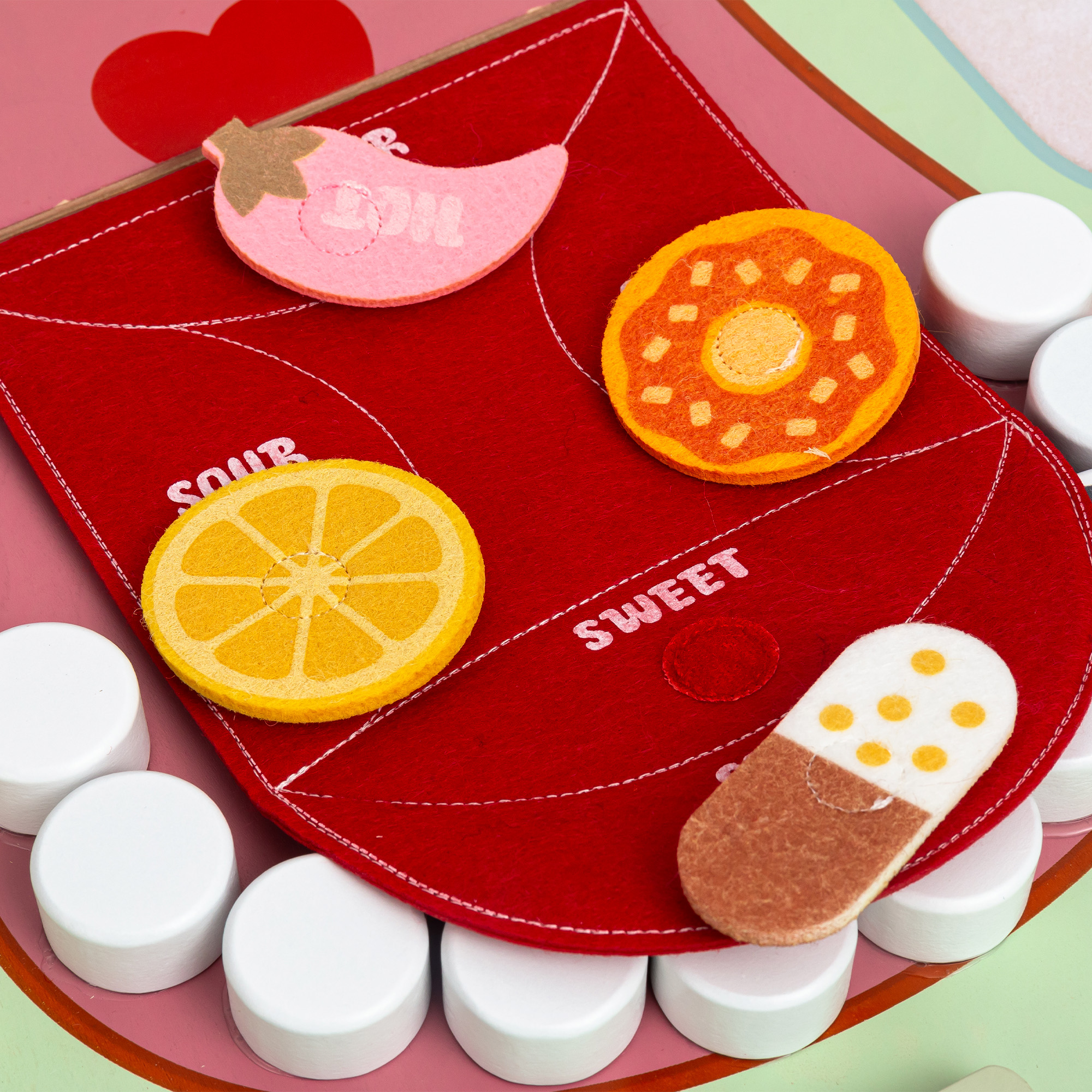 Irrotettava hammas on laudan suurin vetonaula! Pienokaisesi voi poistaa sen ja "hoitaa" sen itse ja sitten asettaa sen takaisin. Se on loistava tilaisuus ensimmäiseen hammaslääkärikokemukseen – hampaiden harjaamiseen, hammastahnan levittämiseen ja "potilaan" terveen hymyn hoitamiseen. Suuri taulu, jossa on kielen muotoisia makujen nimiä, tarjoaa lisähauskuutta ja osoittaa, miten suun eri osat vastaavat makujen tunnistamisesta.