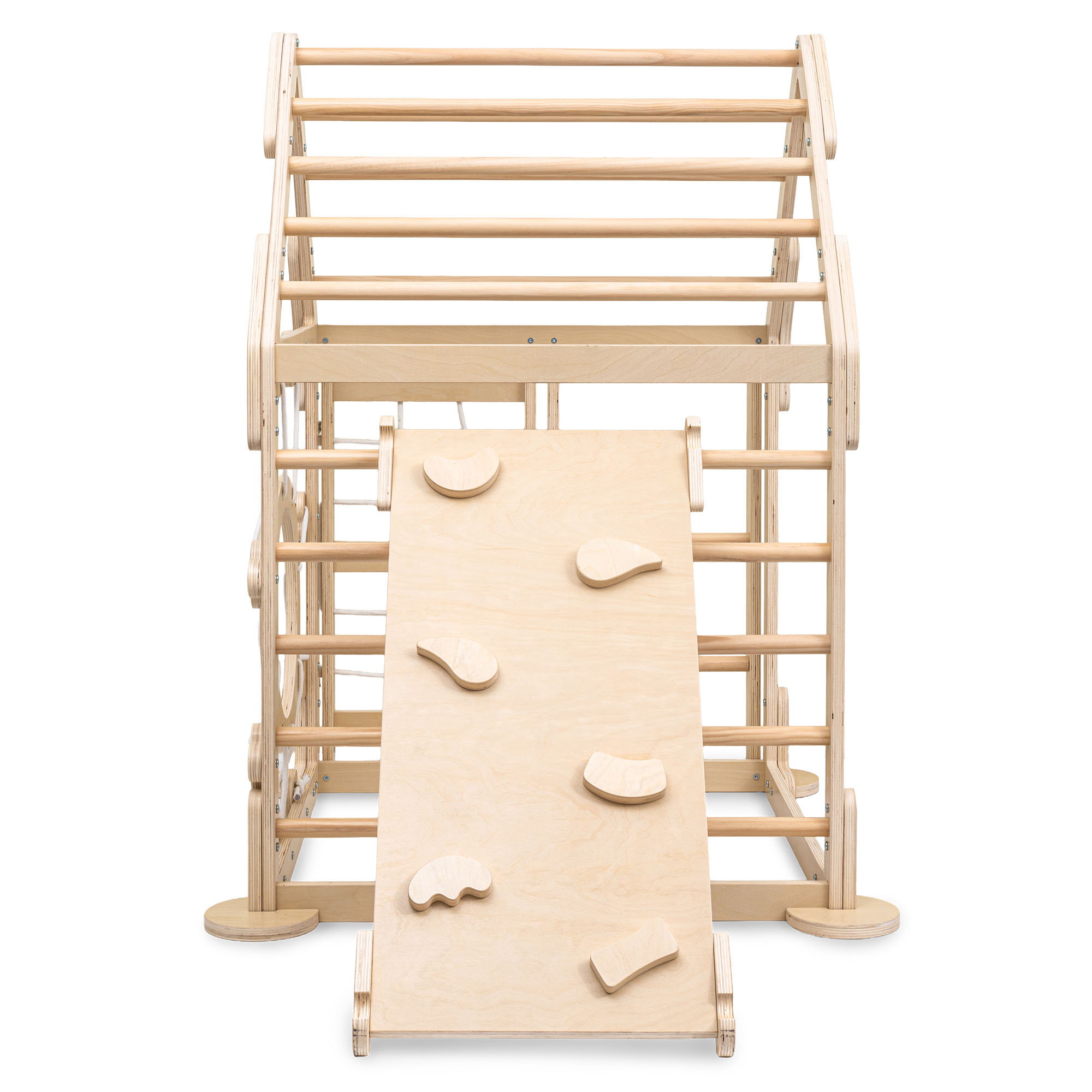 Anna lapsellesi todellinen leikkikenttä... aivan omaan huoneeseensa! Mamabrumin puinen kiipeilytalo yhdistää voimistelutikkaat, kiipeilyseinän, verkon, pyöreän kiipeilyaukon ja katon kiipeilyä varten. Sen monipuolisuus tekee siitä toimintakeskuksen, joka kannustaa liikkumiseen, kehittää fyysistä kuntoa ja tarjoaa tuntikausia hauskaa.