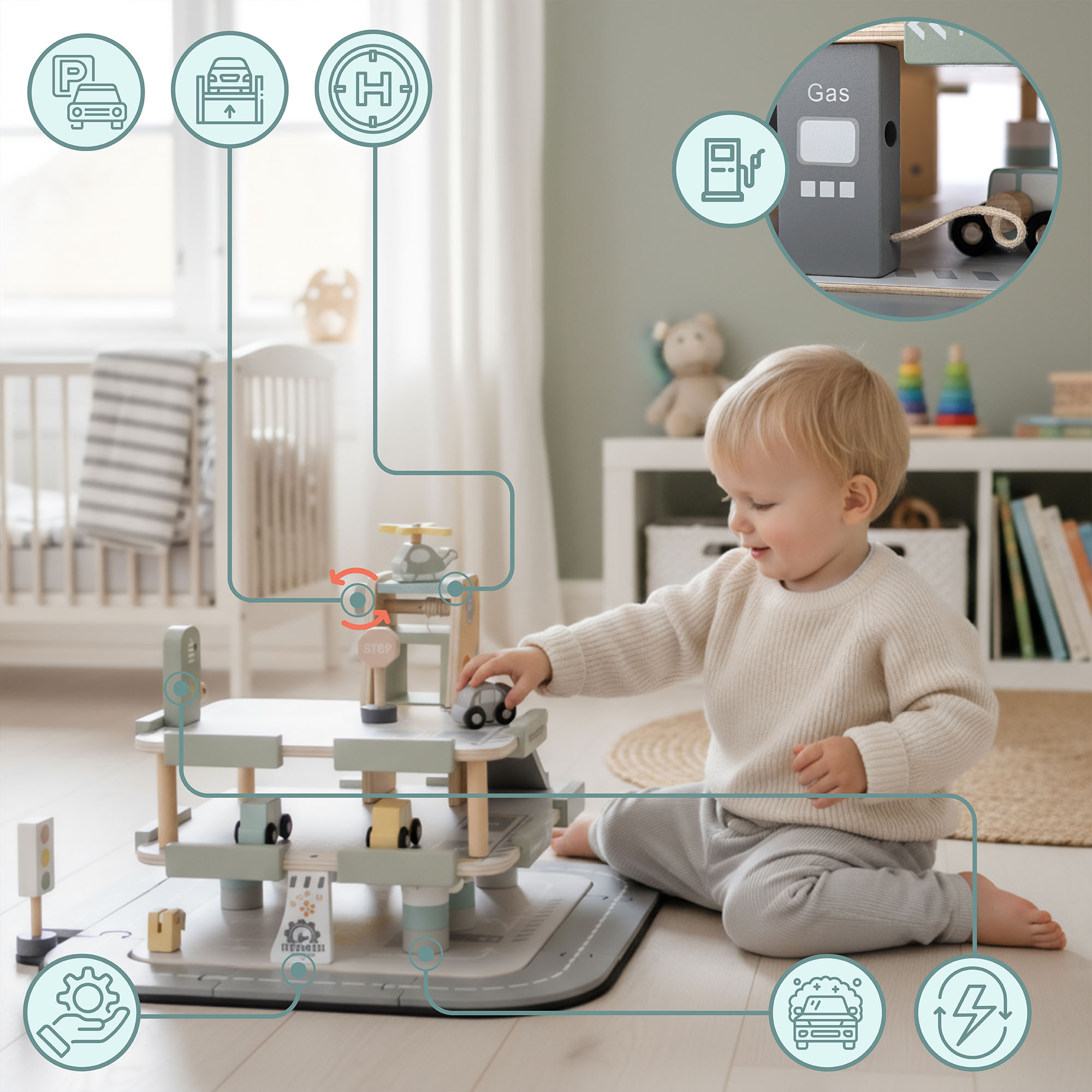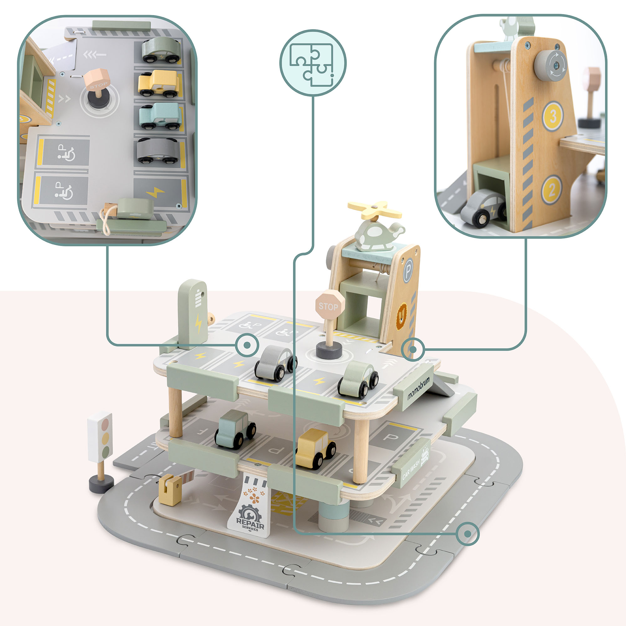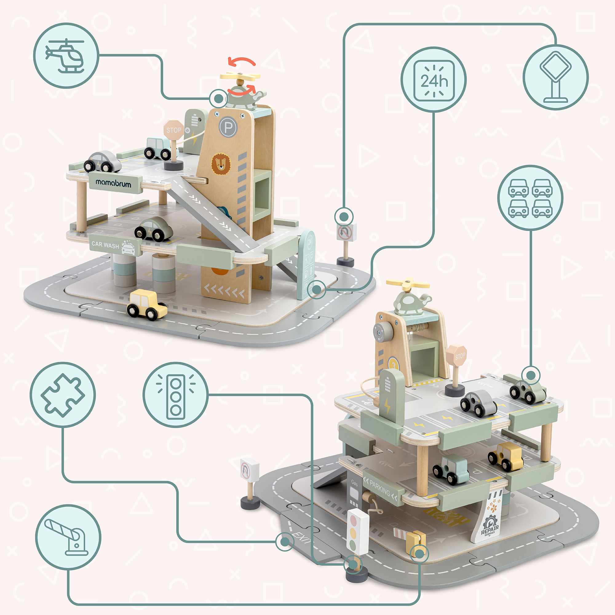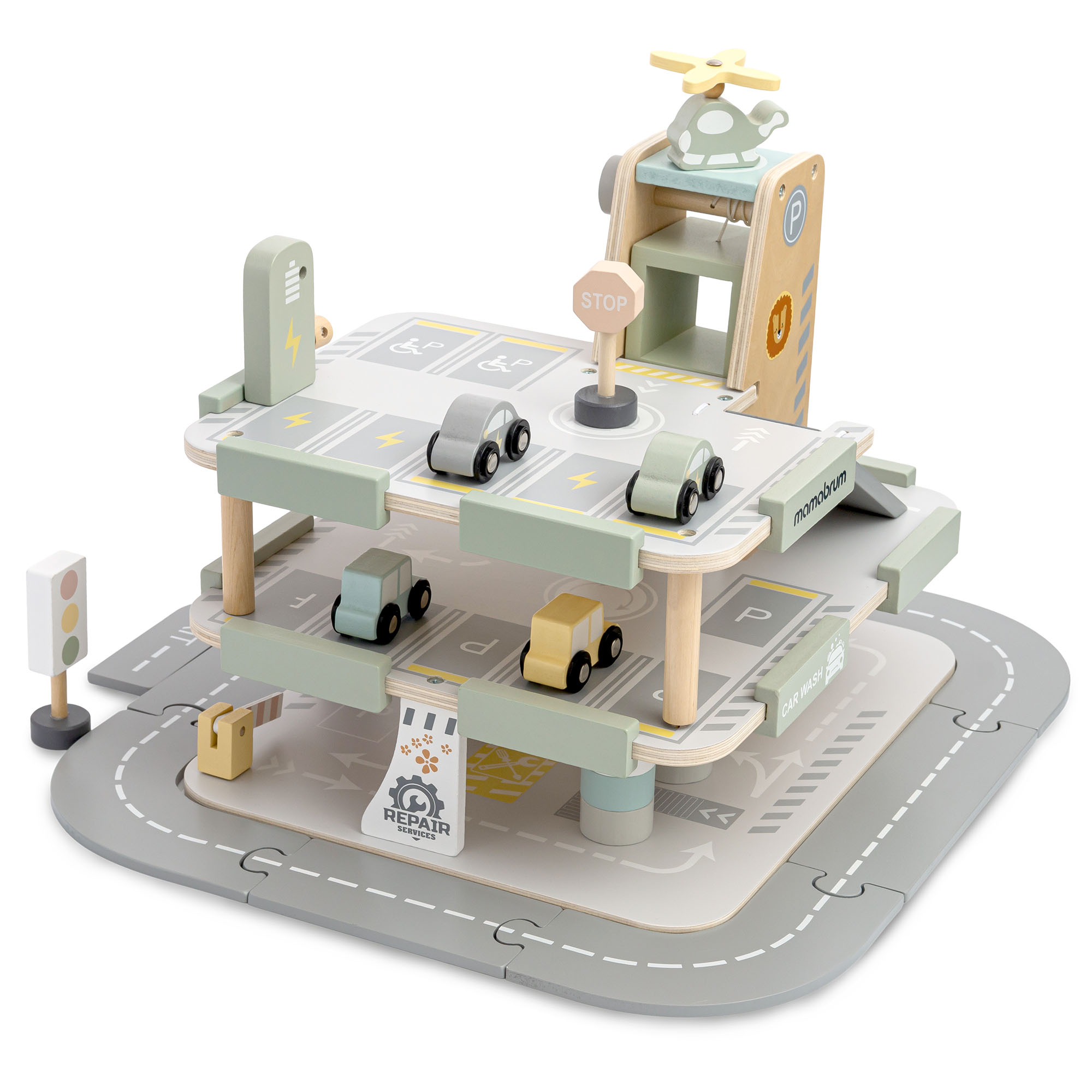 Anna pienokaisellesi oma autokeskus! Puinen, kolmikerroksinen Mamabrum-autotalli ei ole vain pysäköintialue , vaan sieltä löytyy myös huoltoasema, autopesula, korjaamo, sähköautojen latauspiste, siirrettävä autonostin ja helikopterin laskeutumisalusta . Laajan lisävarustevalikoiman avulla lapset voivat luoda lukemattomia leikkiskenaarioita – arkipäiväisistä matkoista jännittäviin kaupunkiseikkailuihin.