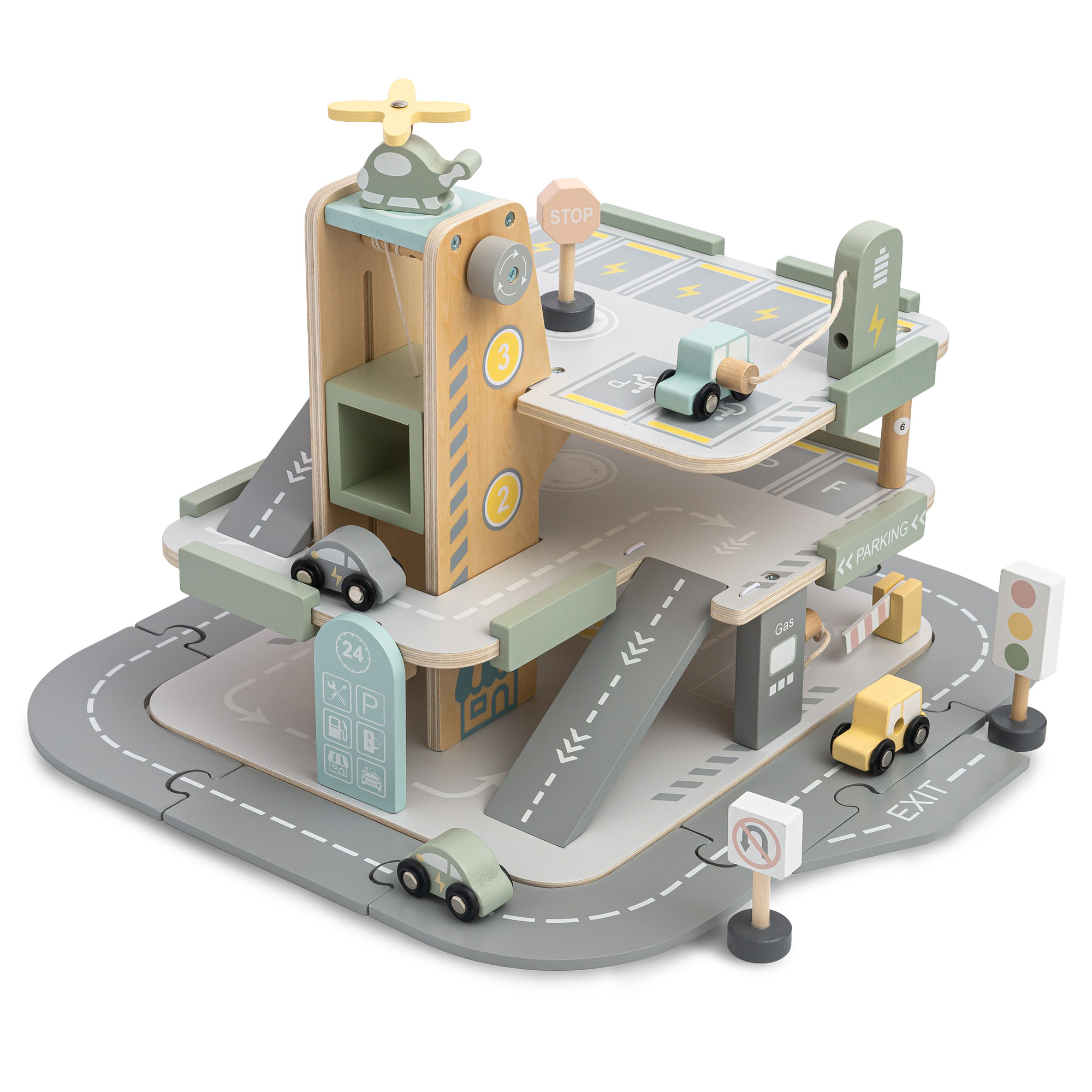 Puinen, kolmikerroksinen lasten autotalli varusteineen – pysäköintialue, huoltoasema, autopesula, helikopteri