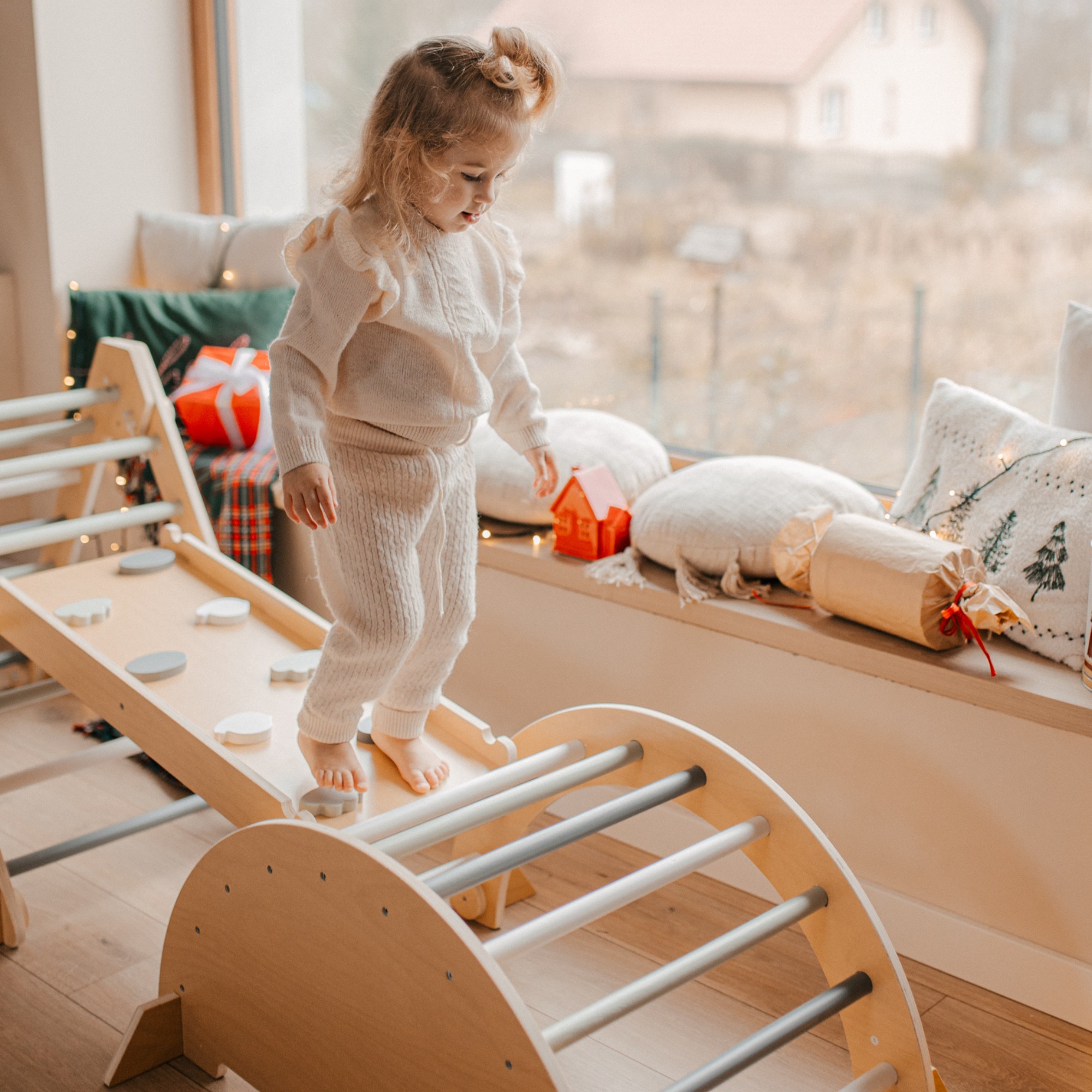 - Leikkipuisto, jossa on Pikler-kolmio, kaksipuolinen ramppi ja kiipeilykaari - monia aktiviteetteja yhdessä rakenteessa!
