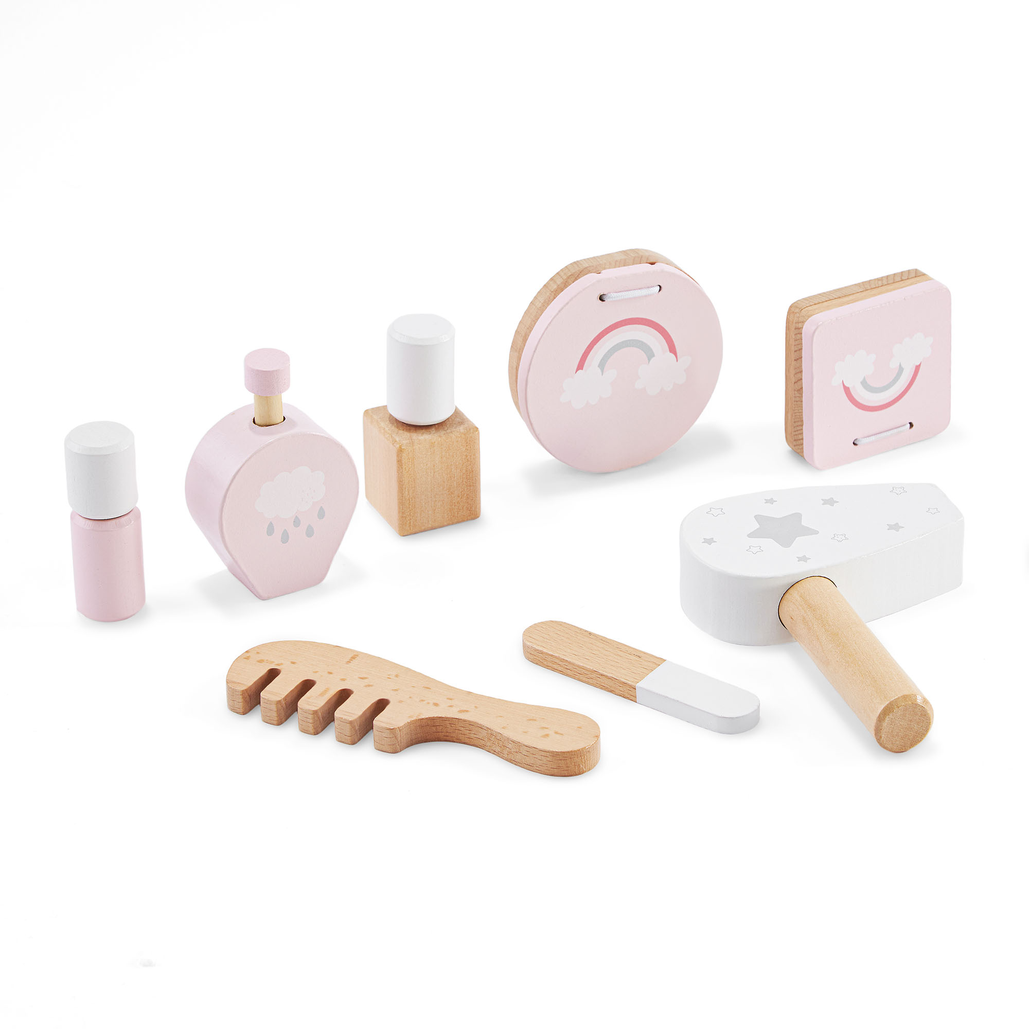Setti sisältää jopa 8 puista lisävarustetta , jotka jäljittelevät oikeita kosmetiikkatyökaluja: luomiväripaletti, kynsilakka, hajuvesi, puuteri, hiuskamman, hiustenkuivaajan, huulipunan ja kynsiviilan.