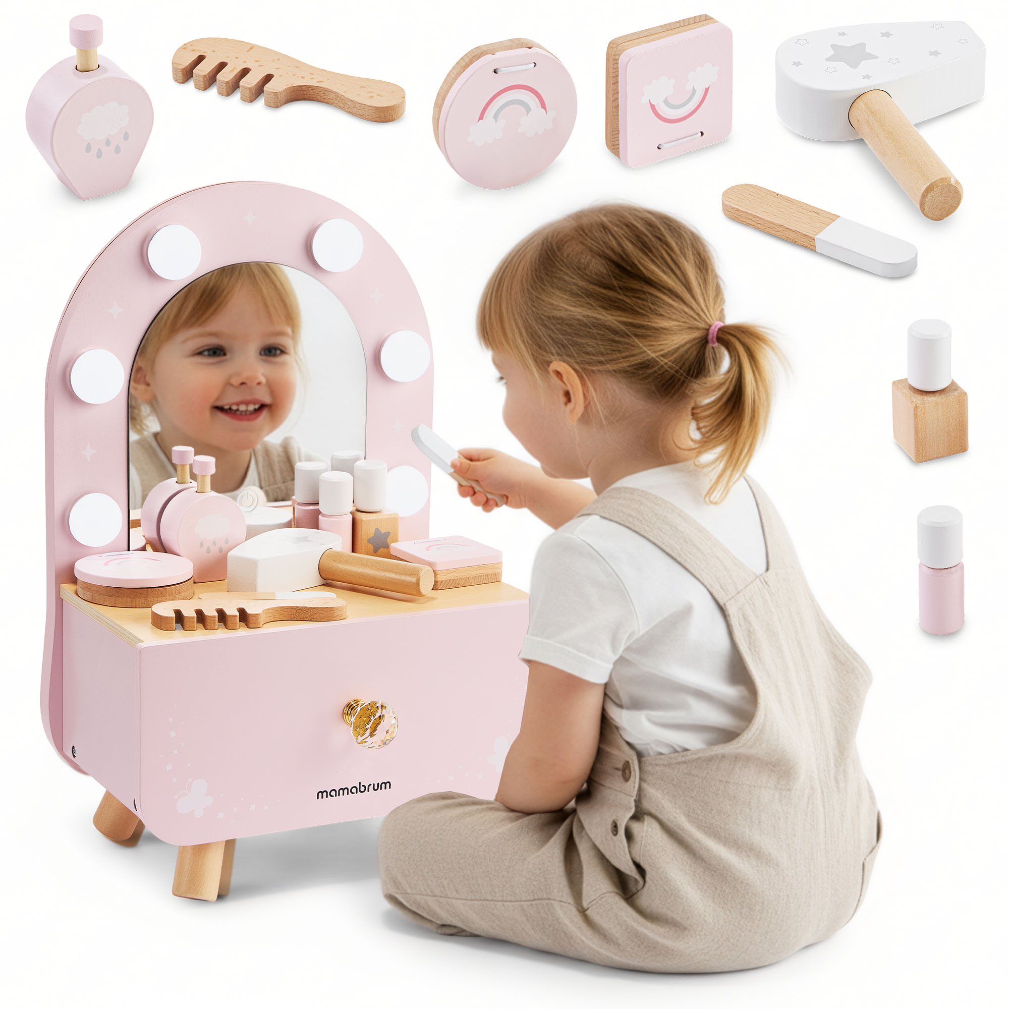 Lapset voivat harjata nukkiensa hiuksia, "meikata", järjestää oman kauneusnurkkauksensa ja oppia järjestelemään asusteita säilyttämällä niitä tilavassa laatikossa. Se ei ole vain kaunis koriste-elementti – se on paikka, jossa lapset voivat luoda, löytää ja ilmaista itseään joka päivä.