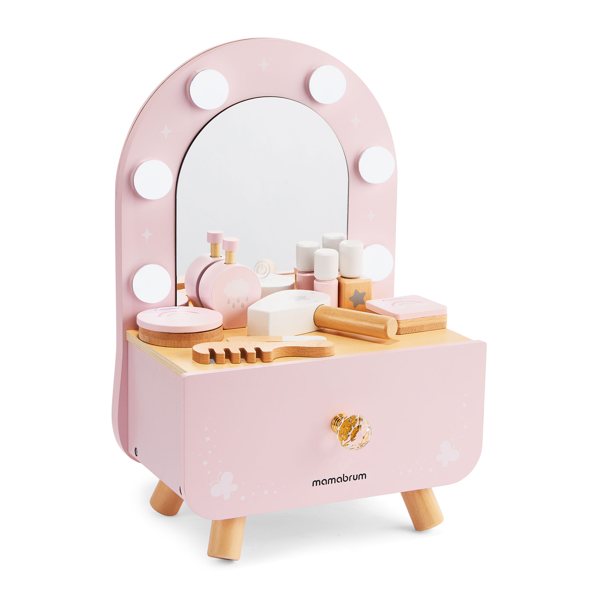 Tämä ihastuttava ja kompakti huonekalu yhdistää eleganssin, toimivuuden ja turvallisen leikin. Täydellinen lapsille, jotka rakastavat aikuisten matkimista ja omien maagisten kauneusrituaalien luomista. Sisäänrakennetun LED-valaistuksen, realististen asusteiden ja kompaktin muotoilun ansiosta se tuo ripauksen satumaista loistoa lastenhuoneeseen – kaikkialle, minne omistajansa menee.