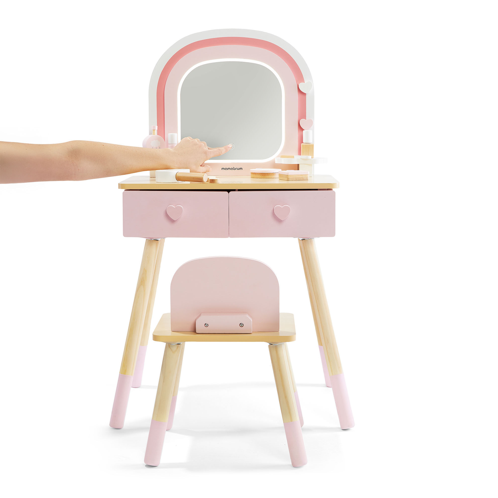 Puinen lasten meikkipöytä LED-valaistuksella ja portaattomalla kirkkauden säädöllä, tuoli ja lisävarusteet