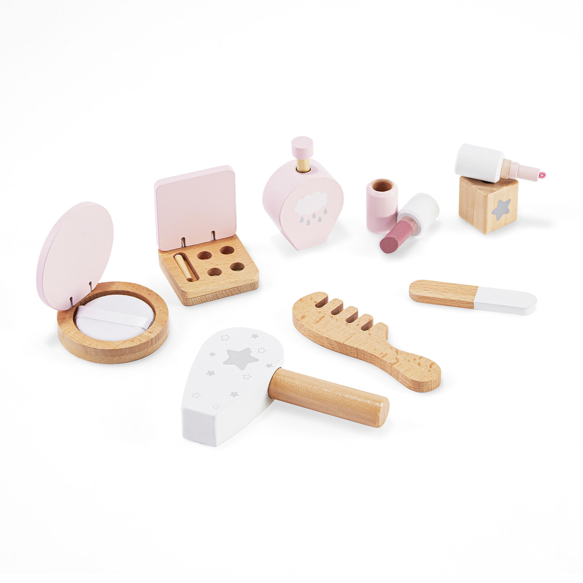 Setti sisältää kahdeksan puista kosmetiikkatarviketta , jotka näyttävät oikeilta aikuisten meikkitarvikkeilta. Setti sisältää luomiväripaletin, kynsilakkaa, hajuvettä, puuterin, kamman, hiustenkuivaajan, huulipunan ja kynsiviilan.