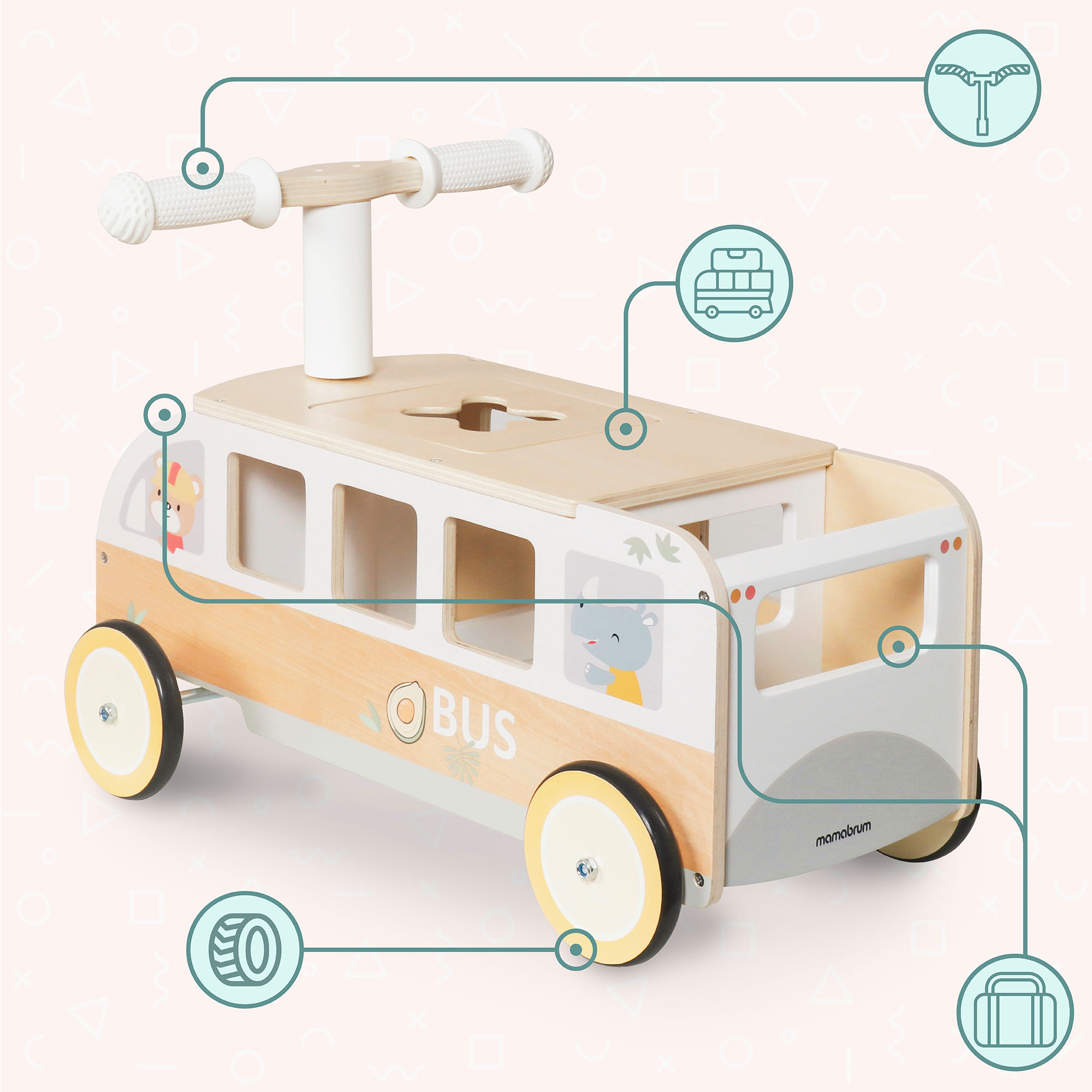 Mamabrum-leikkuri on todellinen aktiivisen ja opettavaisen leikin keskus . Se edistää tasapainoa, koordinaatiota ja itsenäisyyttä sekä kannustaa luovuuteen. Taaperot voivat kuljettaa suosikkilelujaan, säilyttää pieniä esineitä ja järjestää omia minimatkojaan .