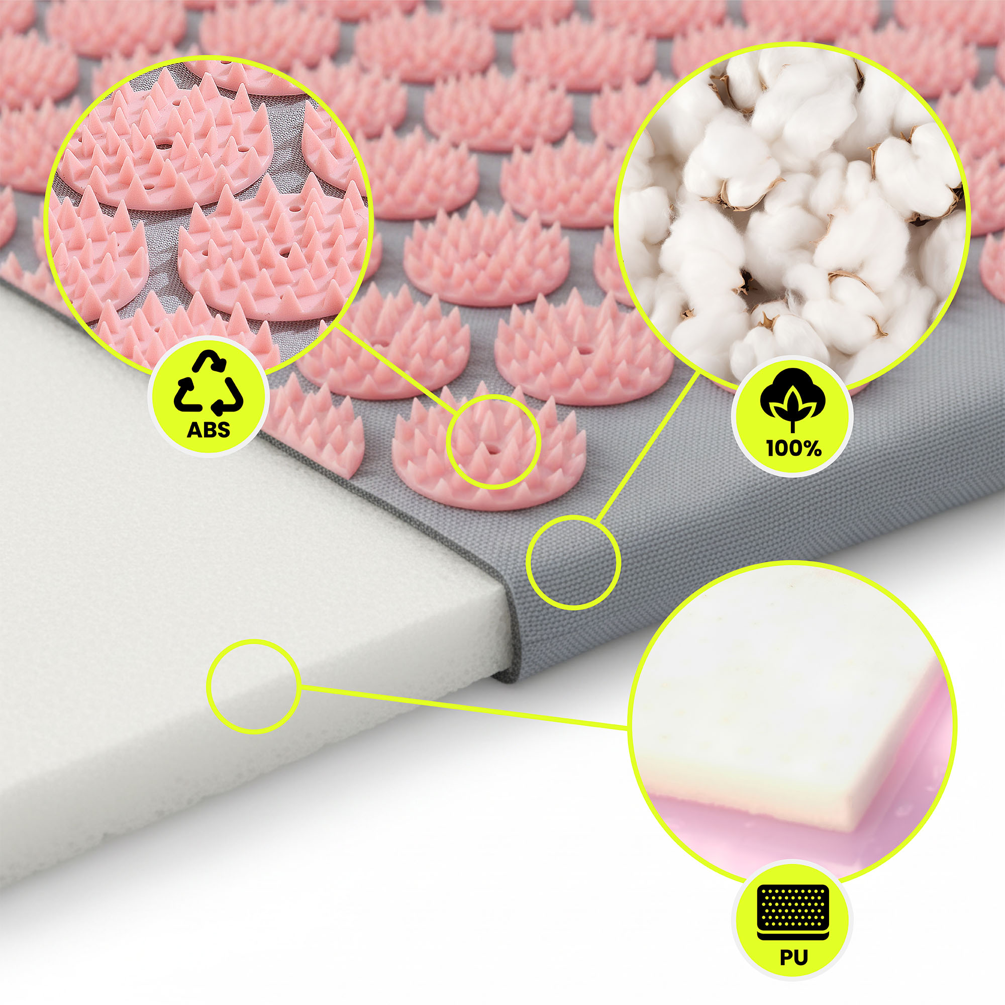 Jokainen setin osa on suunniteltu mukavuutta ja jokapäiväistä käyttöä ajatellen. Patjan ja tyynynpäälliset on valmistettu luonnollisesta 100 % puuvillasta , joka on pehmeää ja tarjoaa miellyttävän kosketuksen ihoa vasten, kun taas sisäpuoli on täytetty joustavalla vaahtomuovilla vakaan tuen takaamiseksi. Kestävissä muovipiikeissä on turvallisesti pyöristetyt kärjet , jotka tarjoavat hellävaraista mutta huomattavaa stimulaatiota. Kevyt ja kulutusta kestävä nailoninen kantolaukku täydentää setin.