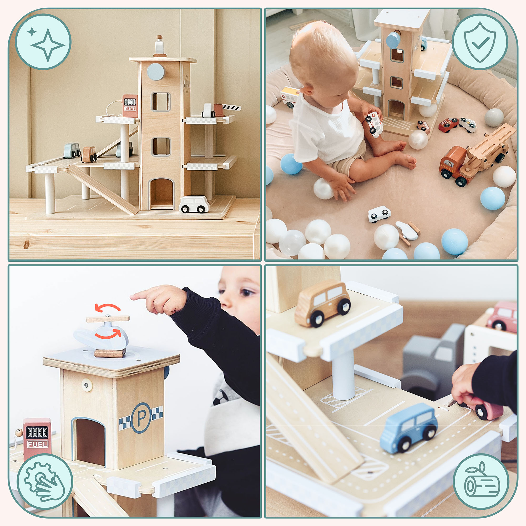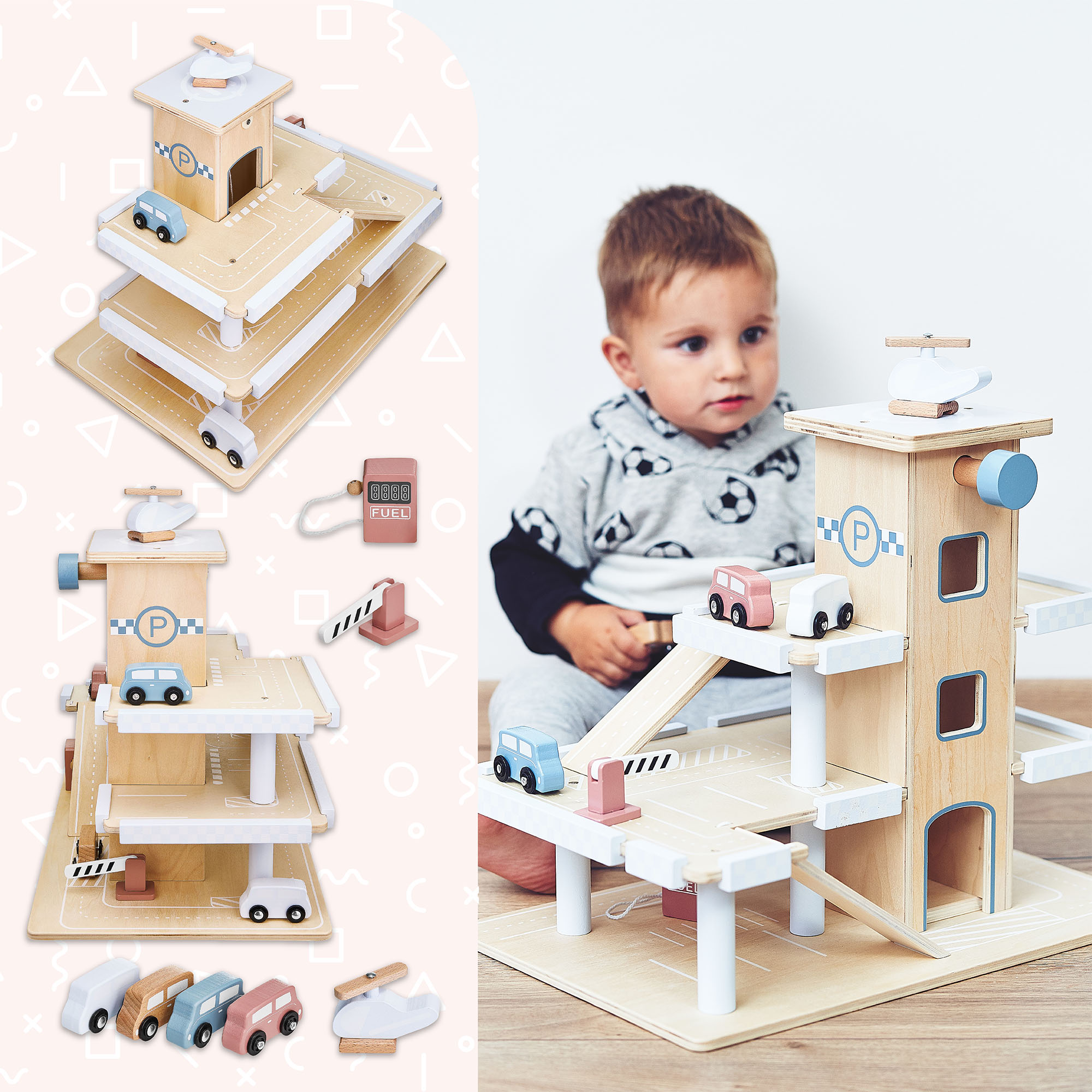 Autotallissa on kolme tasoa ja liukumäki. Niin luova kuin lapsi voi leikkiä puulelulla. Leikkiessään lapsi harjoittelee silmä-käsi-koordinaatiota. Lelu on valmistettu korkealaatuisesta puuvanerista, lisävarusteet on maalattu ekologisilla maaleilla.
