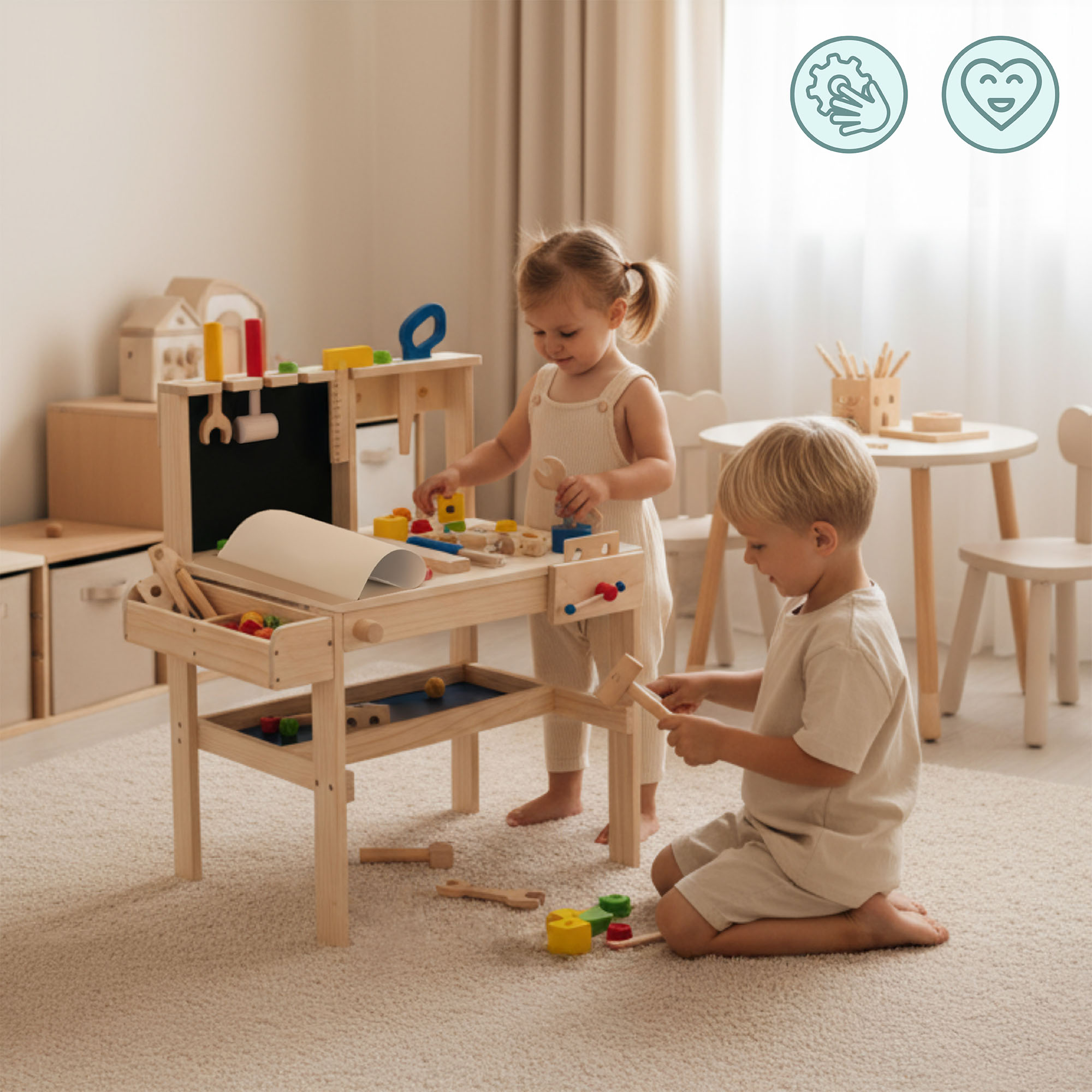 Kaunis puinen DIY-sarja on loistava lelu, jonka avulla taapero voi kehittää kädentaitojaoppia työkaluista ja niiden käytöstä. Lapset rakastavat tällaista leikkiä!