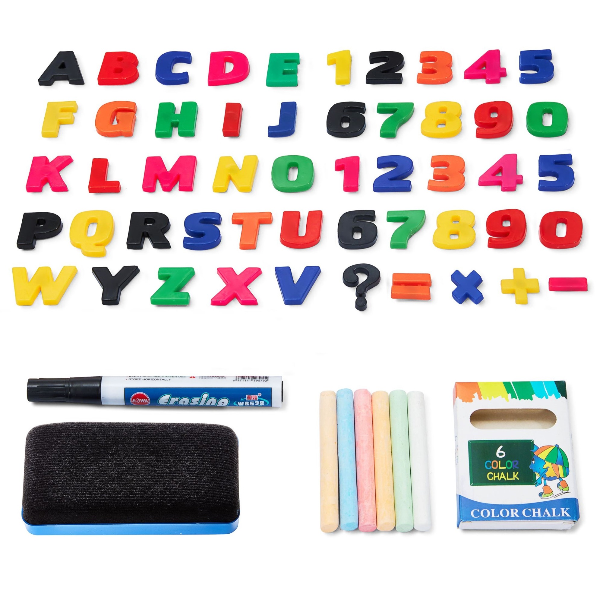 Setti sisältää liidut, tussin, erikoissienen taulun puhdistamiseen, magneettiset kirjaimet ja numerot. Taulun alla on abakus, jonka ansiosta lapsi voi oppia matematiikan perusteet, ja kello, jonka avulla lapsi oppii lukemaan tunteja. Taulussa on myös käytännöllinen hylly tarvikkeita varten.